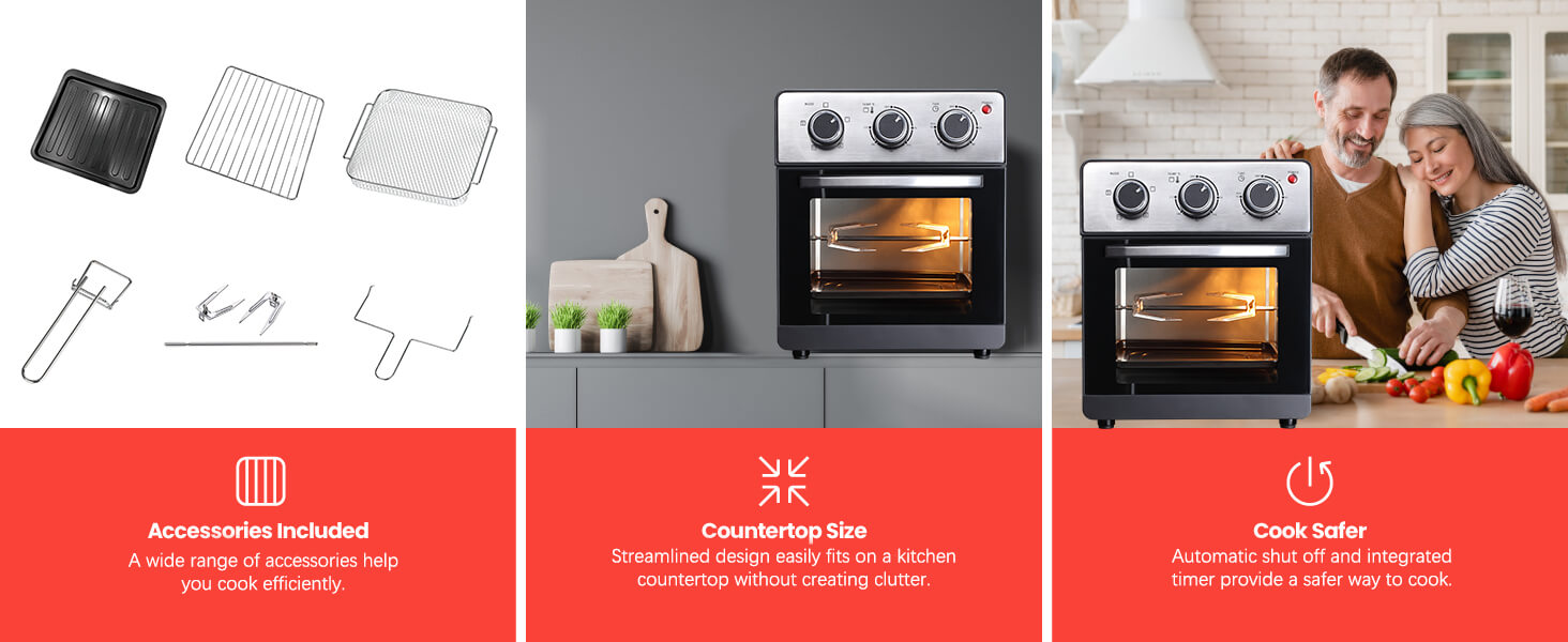 5. Aplicación multifuncional: Tiene múltiples funciones como hornear, freír al aire, tostar, mantener caliente y convección para satisfacer sus diferentes necesidades de cocina.