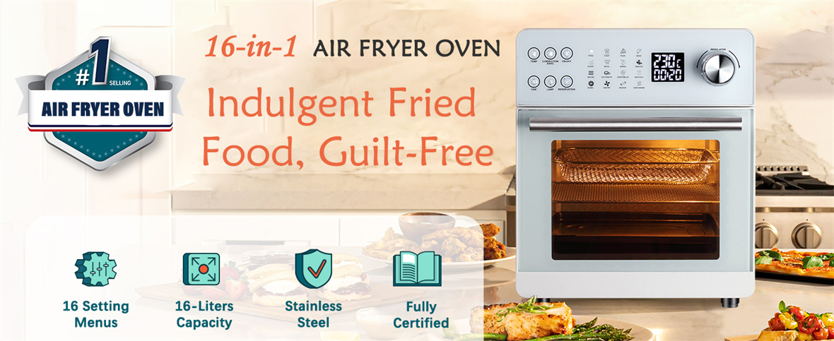 Eleve su destreza culinaria con la combinación perfecta de elegancia, tecnología e innovación fácil de usar que ofrece el horno freidora de aire blanco con control fácil de usar y doble vidrio.