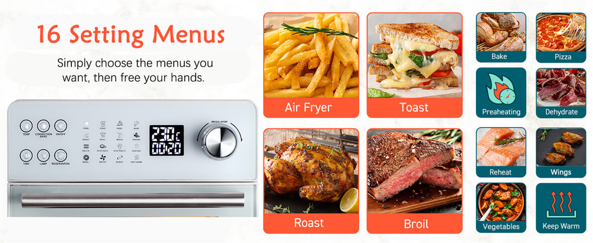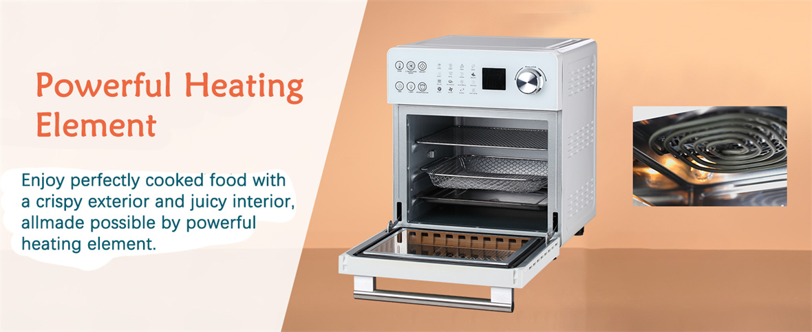 Mantenimiento sin esfuerzo: El acabado blanco no sólo mejora la estética sino que también simplifica el mantenimiento.Mantenga su horno Air Fryer impecable con un mínimo esfuerzo, lo que le permitirá concentrarse en lo más importante: el placer de cocinar.