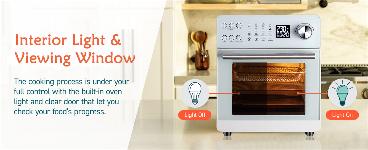 Elegancia de doble vidrio: el horno Air Fryer presenta un diseño de doble vidrio, no solo por su atractivo estético sino también para mejorar su experiencia culinaria.Observe cómo se desarrollan sus creaciones culinarias a través del vidrio transparente, mientras se beneficia del aislamiento mejorado para una cocción precisa y eficiente.