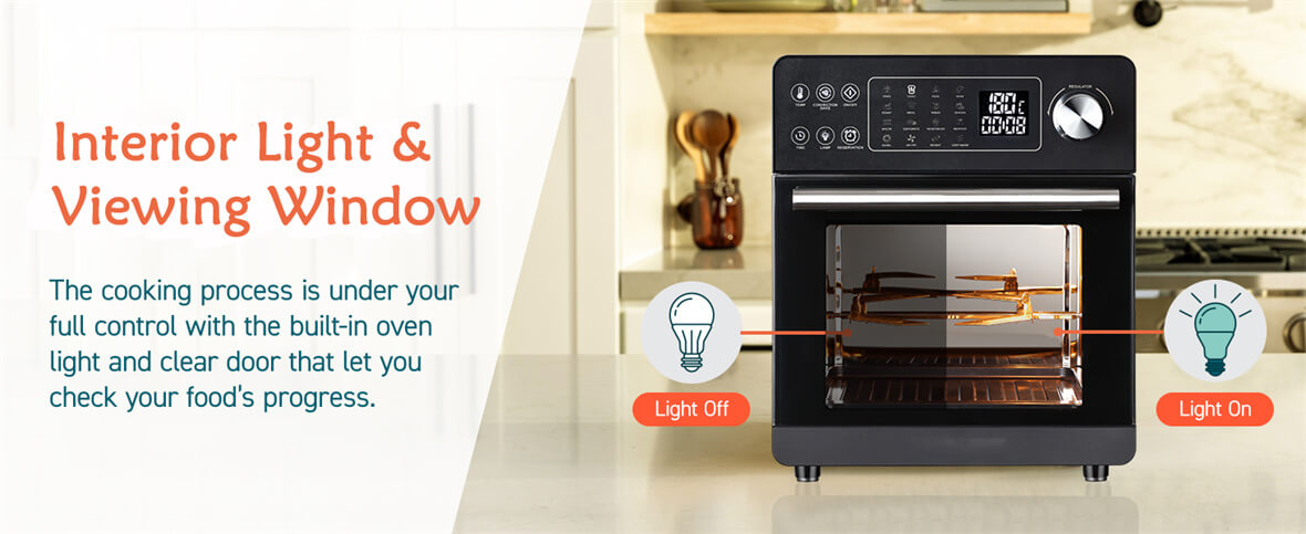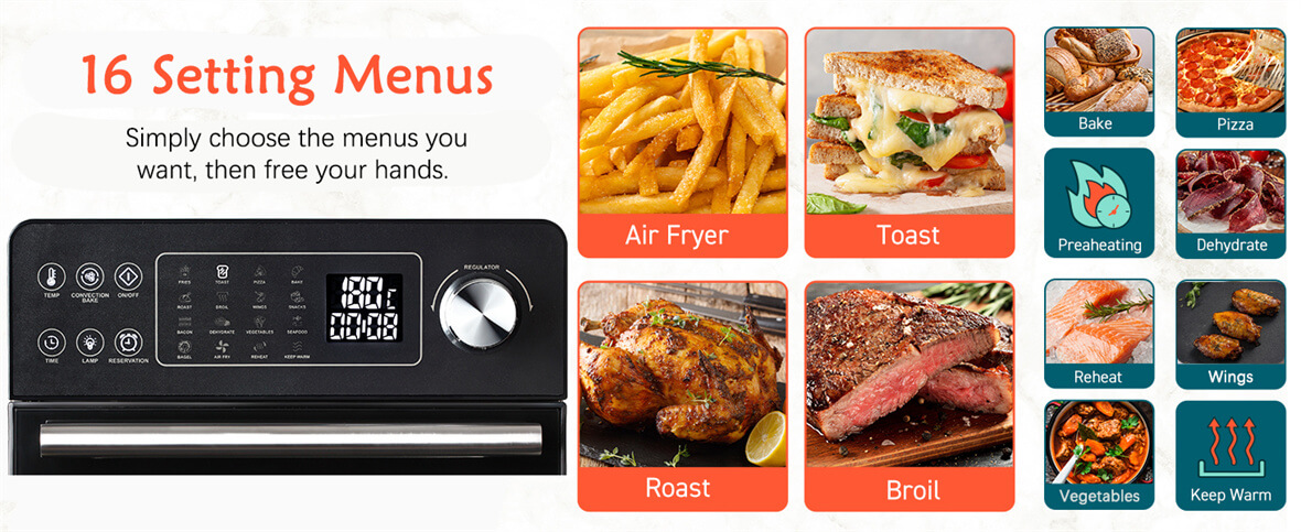Arsenal culinario multifuncional: dé rienda suelta a su creatividad culinaria con el horno freidora de aire multifuncional.Desde patatas fritas crujientes hasta suculentos asados, este electrodoméstico admite una variedad de estilos de cocina.Hornee, ase, cocine a la parrilla y fría al aire: todo en una unidad compacta y eficiente.