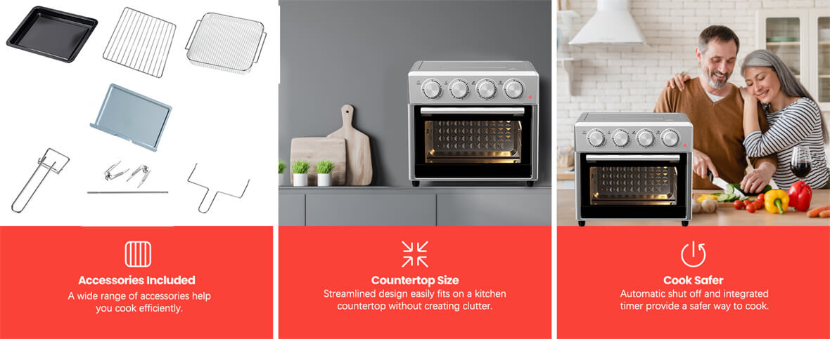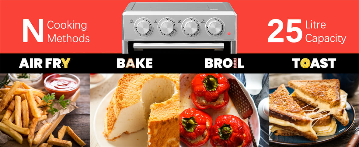 El horno Air Fryer es perfecto para cocinas domésticas, pequeños restaurantes y reuniones.Destaca para hornear, freír, tostar y asar diversos ingredientes como verduras, carnes, mariscos y pan.Desde el desayuno hasta el almuerzo, la cena y los refrigerios, el Air Fryer Oven puede satisfacer sin esfuerzo una amplia gama de necesidades culinarias.