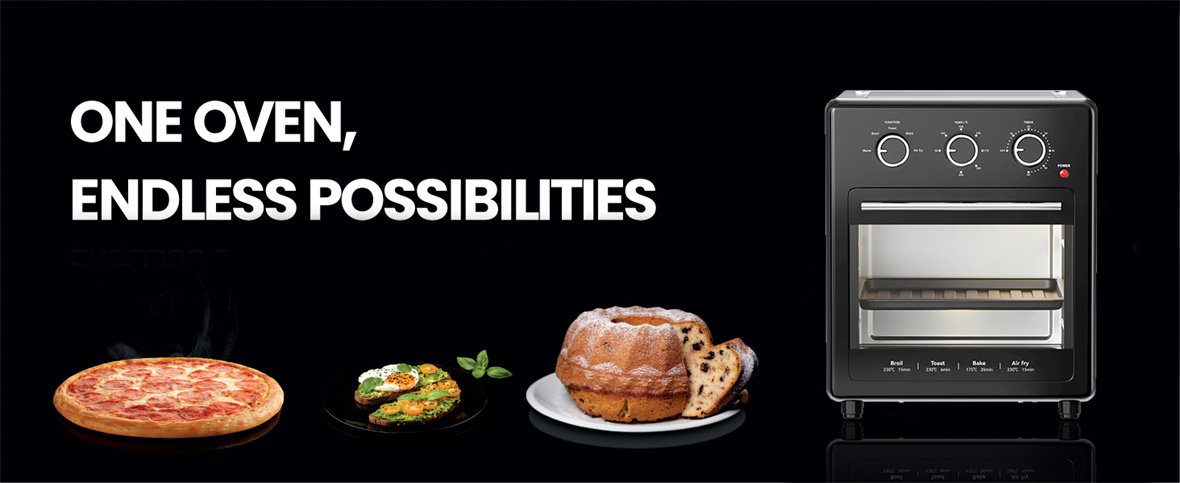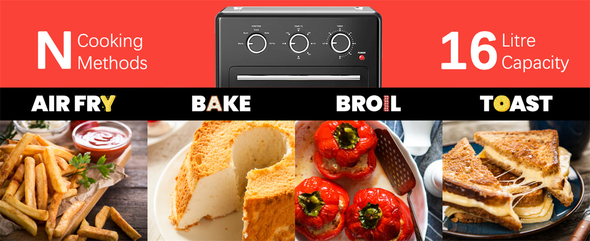 1. Versatilidad: El horno freidora de aire de un solo vaso ofrece cinco modos de cocción, que incluyen calentar, asar, hornear, asar y freír al aire.Se adapta a una amplia gama de estilos de cocina, desde calentar suavemente hasta freír crujientes al aire, lo que le permite cocinar varios platos con facilidad y perfección.