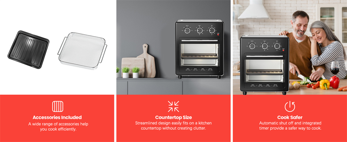 6. Diseño fácil de usar: El horno freidora de aire de vidrio único cuenta con una base de plástico PP y un panel decorativo de acero inoxidable para la manija de la puerta, lo que mejora tanto la funcionalidad como la estética, convirtiéndolo en una adición atractiva a su cocina.