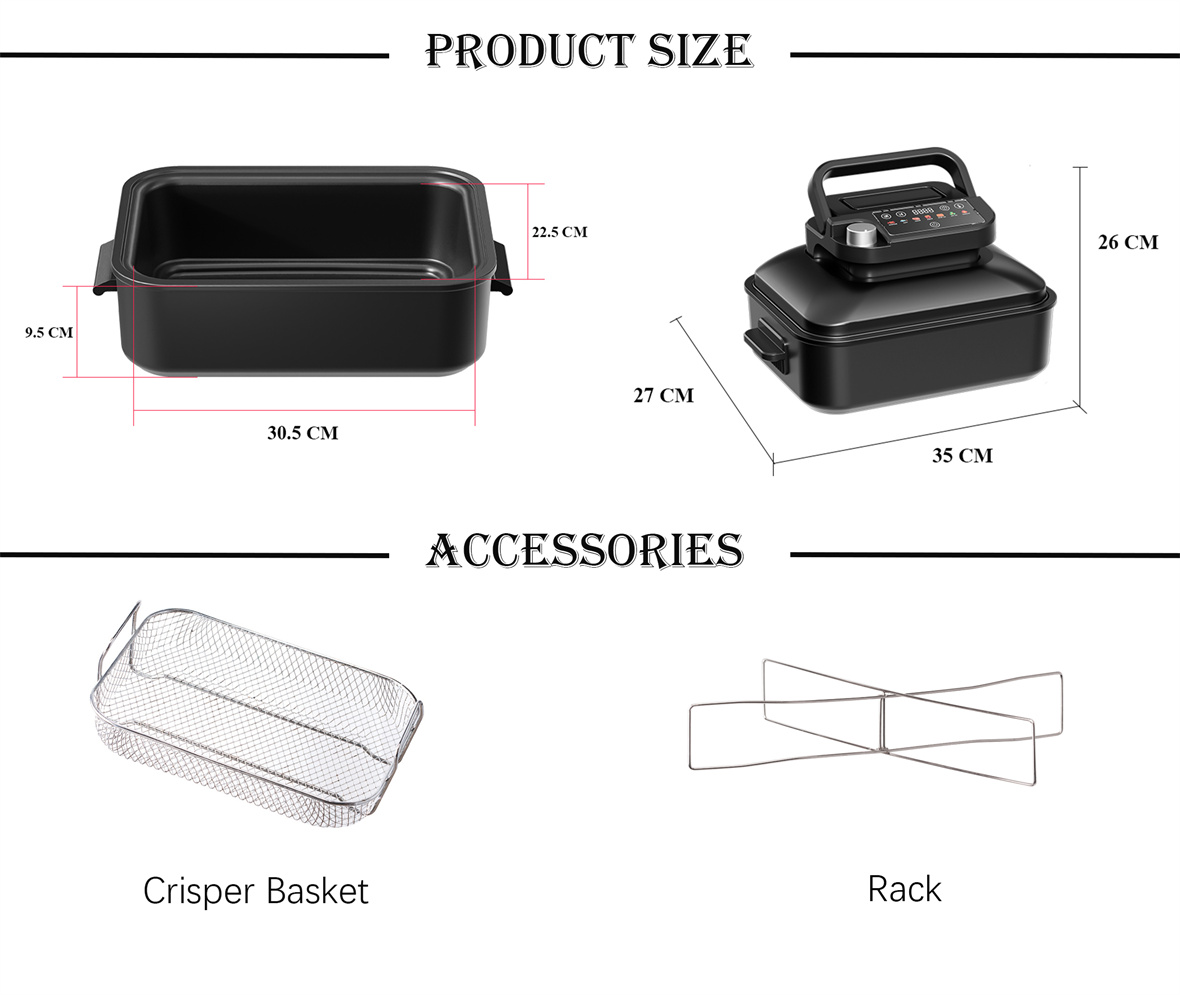 2. Cocina Saludable: En comparación con las freidoras tradicionales, Air Fryer Grill requiere solo una pequeña cantidad de aceite y utiliza circulación de aire caliente a alta velocidad para lograr resultados crujientes al tiempo que reduce la ingesta de grasa, lo que le permite disfrutar de una cocina más saludable.