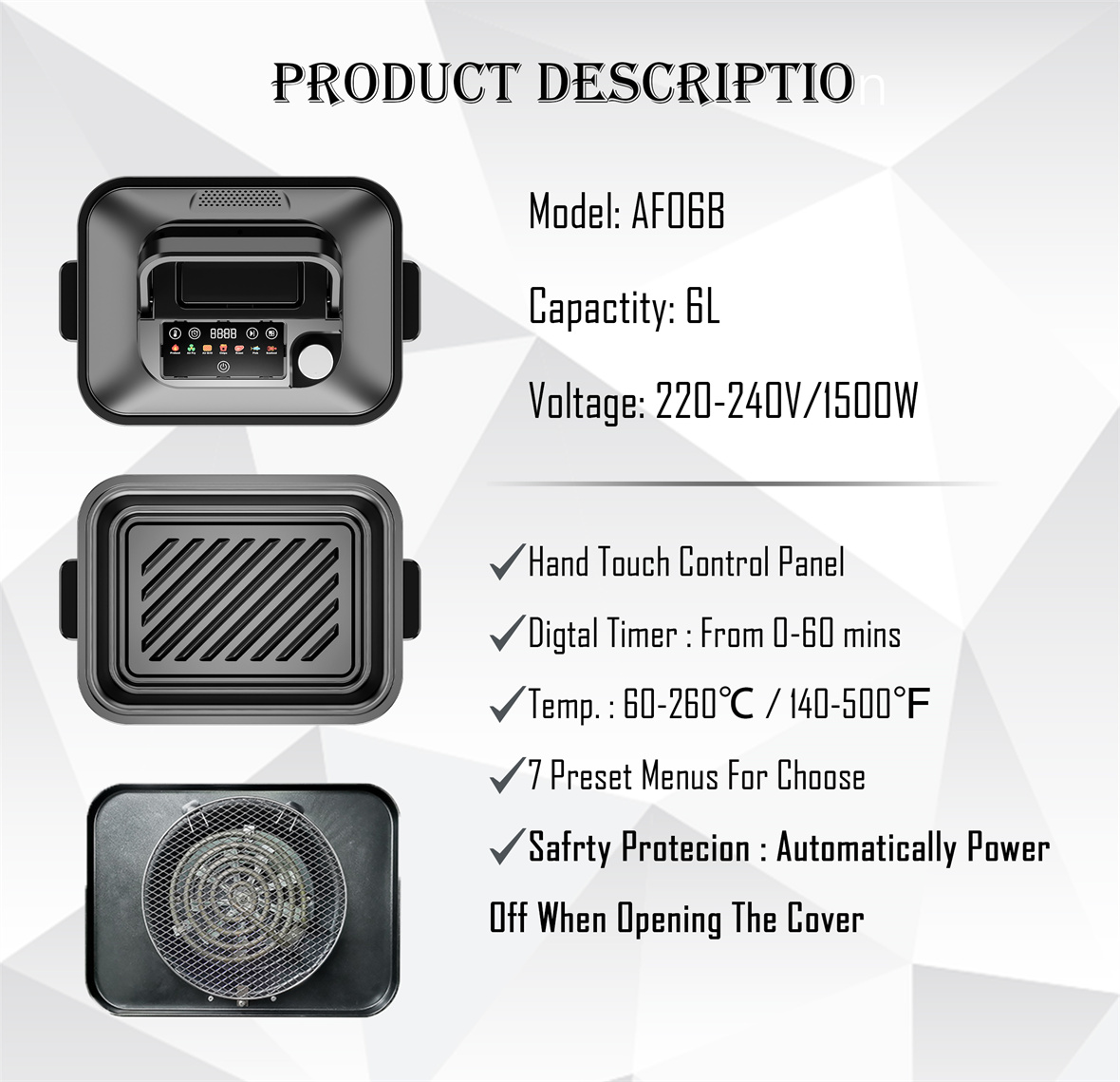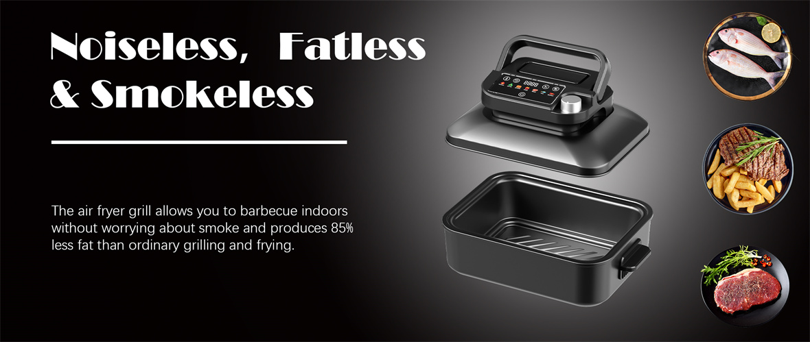 1. Menos humo: Air Fryer Grill utiliza tecnología de circulación de aire para minimizar el humo durante la cocción, manteniendo su cocina limpia y reduciendo el impacto negativo del humo en su salud.